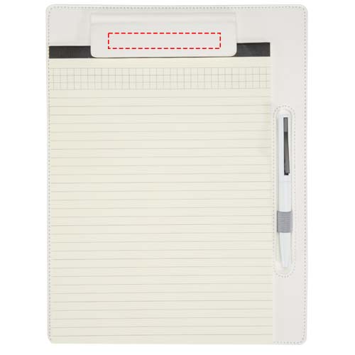 De Clast clipboard combineert een strak PU-leren design met praktische functies voor vergaderingen en dagelijks gebruik. Geschikt voor standaard A4-papier en voorzien van een magnetische klem, gestikte randen en ingebouwde pennenlus. Binnenin zitten 26 gelinieerde vellen van 65 g/m² papier en een balpen met een bovenkant van gerecycled plastic en een onderkant van RCS-gecertificeerd gerecycled aluminium. De Juana balpen is ook los verkrijgbaar. Formaat clipboard: 25,5 × 33 cm. Inktkleur: zwart.